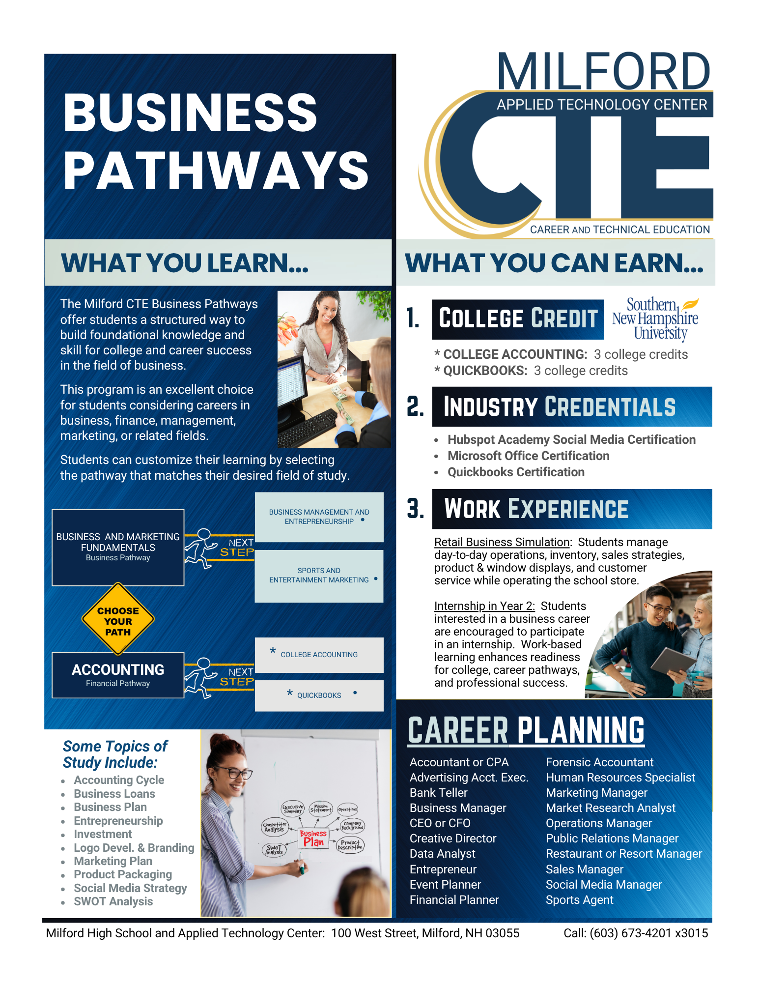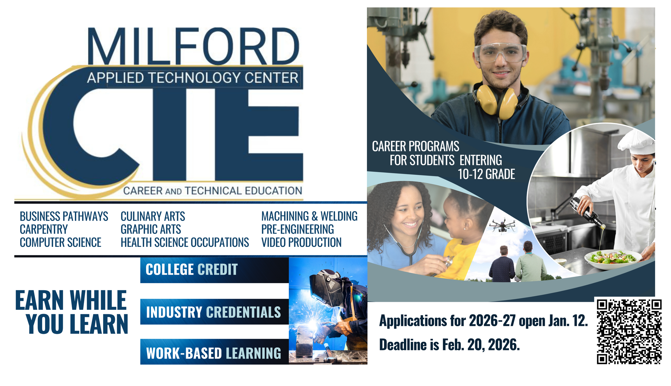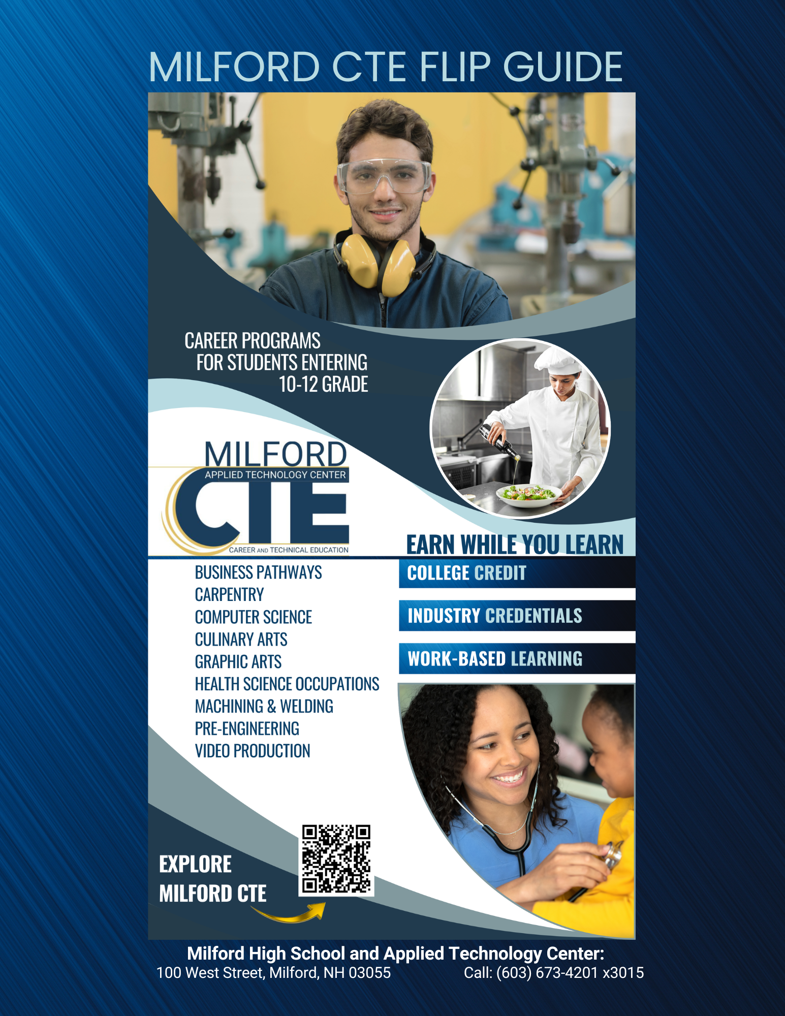 DOWNLOAD our Milford CTE Flip Book to review the details about each program, credentials you can earn, college credits, and internship/apprenticeship offerings.
