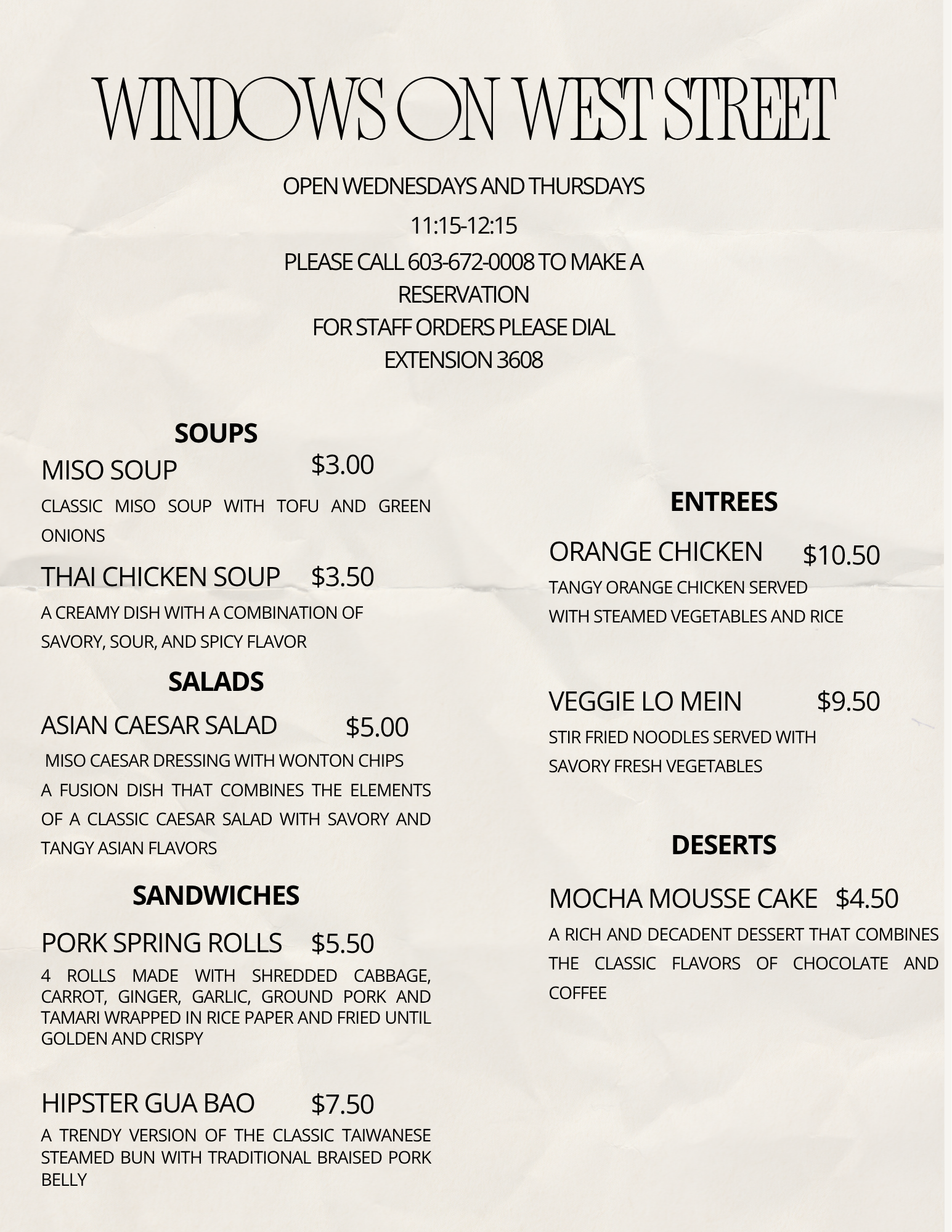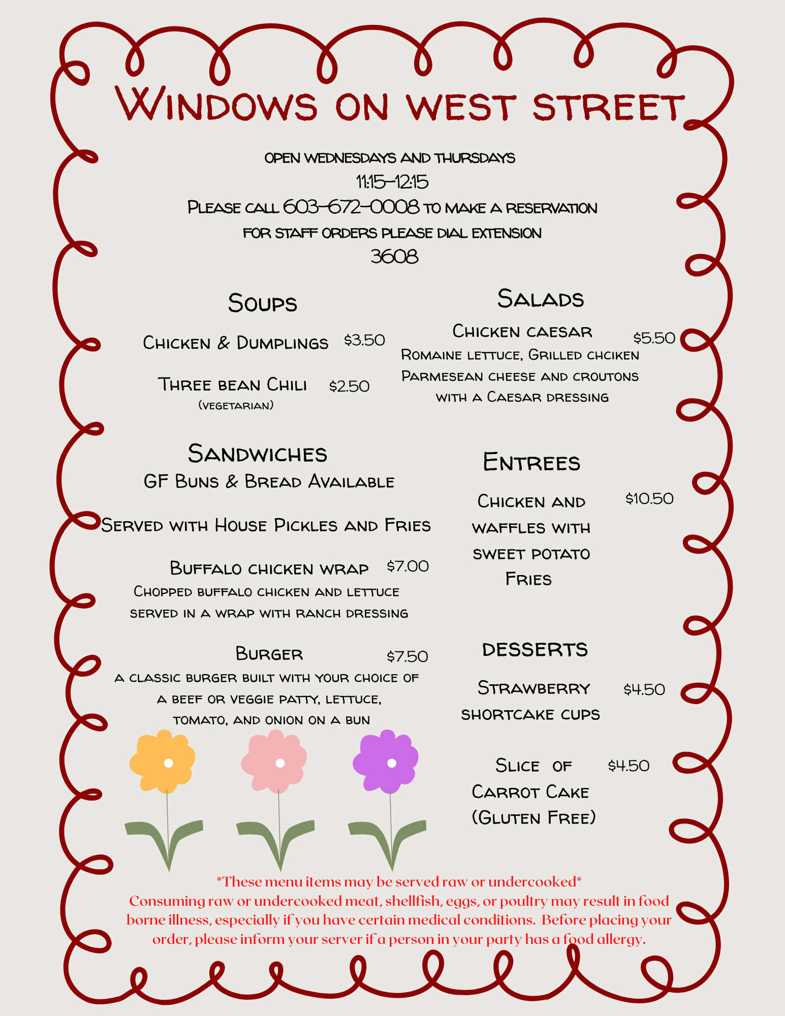 For reservations, please call 603-672-0008